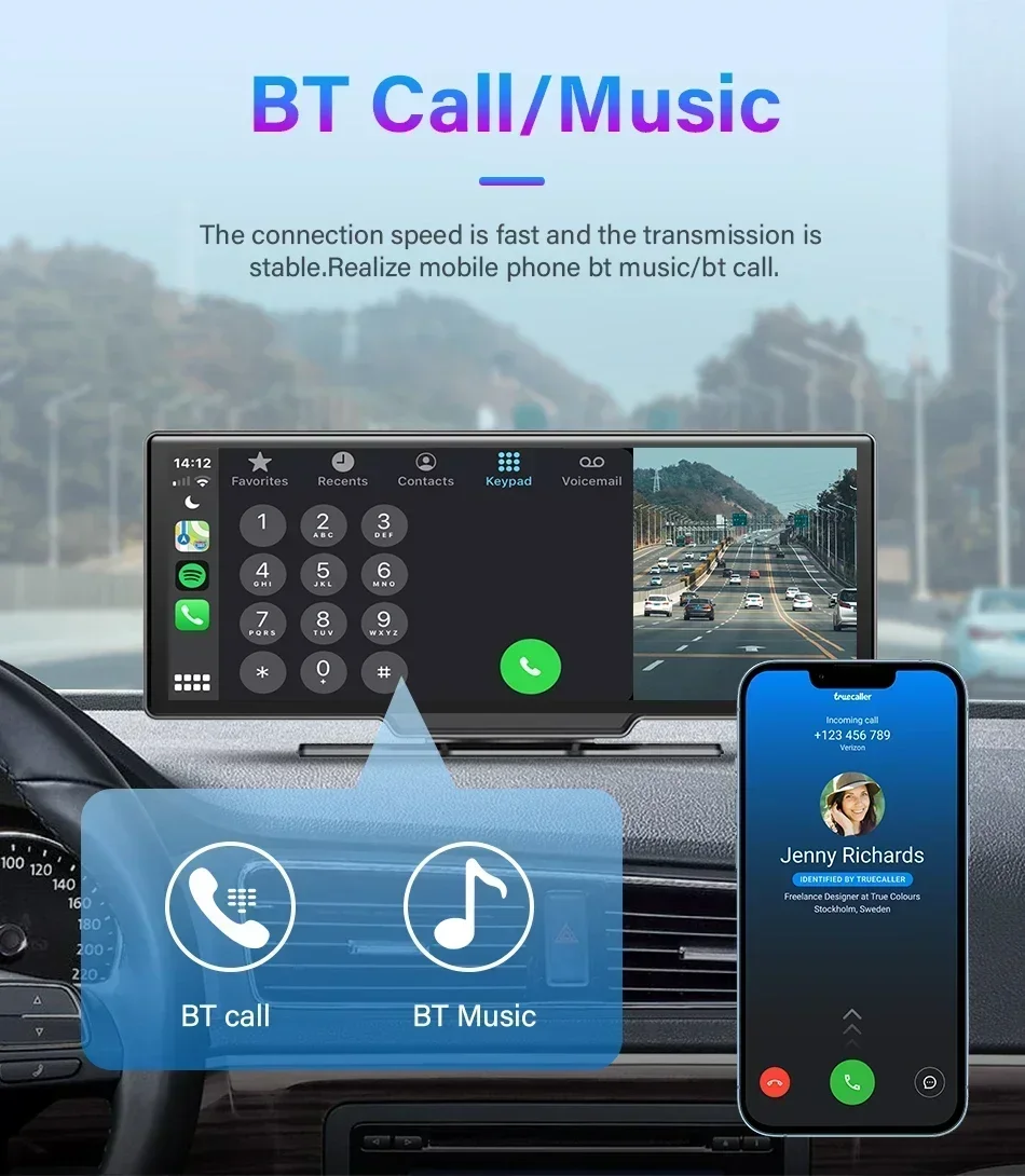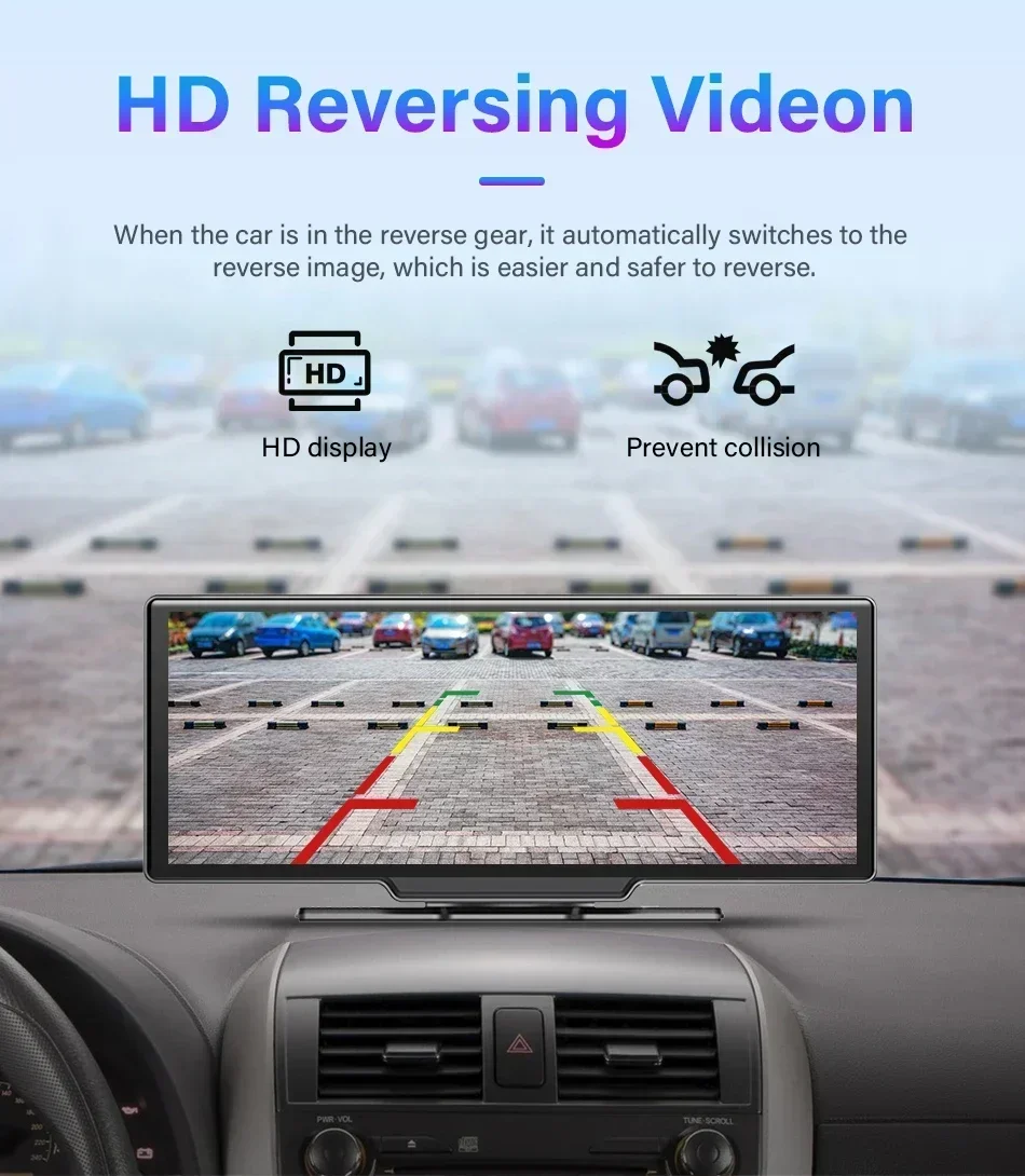 Dashcam Caméra de tableau de bord sans fil pour voiture, Carplay et Android, commande vocale et navigation automatique, caméra de recul DV R, écran BT, 10.26"